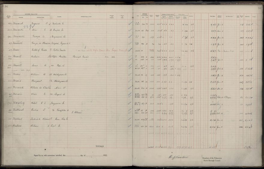 Palmerston North Borough Council rate book, listing rate payers for the years (1 April - 31 March) 1922 - 1923. Gives names, street, owner (if different to rate payer), legal description of property, capital and unimproved values and rates paid.