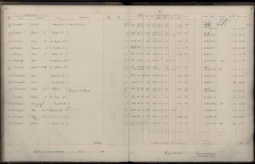 Palmerston North Borough Council rate book, listing rate payers for the years (1 April - 31 March) 1922 - 1923. Gives names, street, owner (if different to rate payer), legal description of property, capital and unimproved values and rates paid.