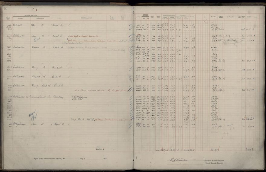 Palmerston North Borough Council rate book, listing rate payers for the years (1 April - 31 March) 1922 - 1923. Gives names, street, owner (if different to rate payer), legal description of property, capital and unimproved values and rates paid.