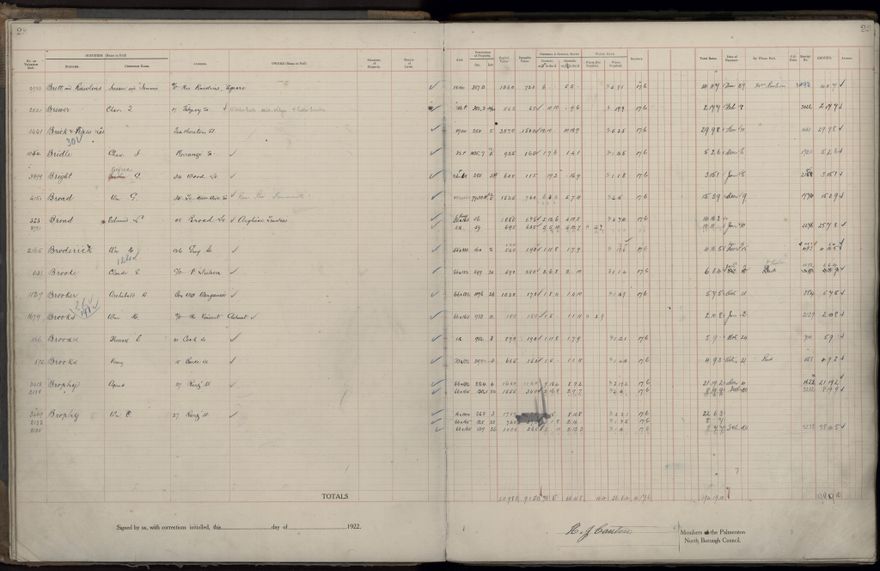 Palmerston North Borough Council rate book, listing rate payers for the years (1 April - 31 March) 1922 - 1923. Gives names, street, owner (if different to rate payer), legal description of property, capital and unimproved values and rates paid.