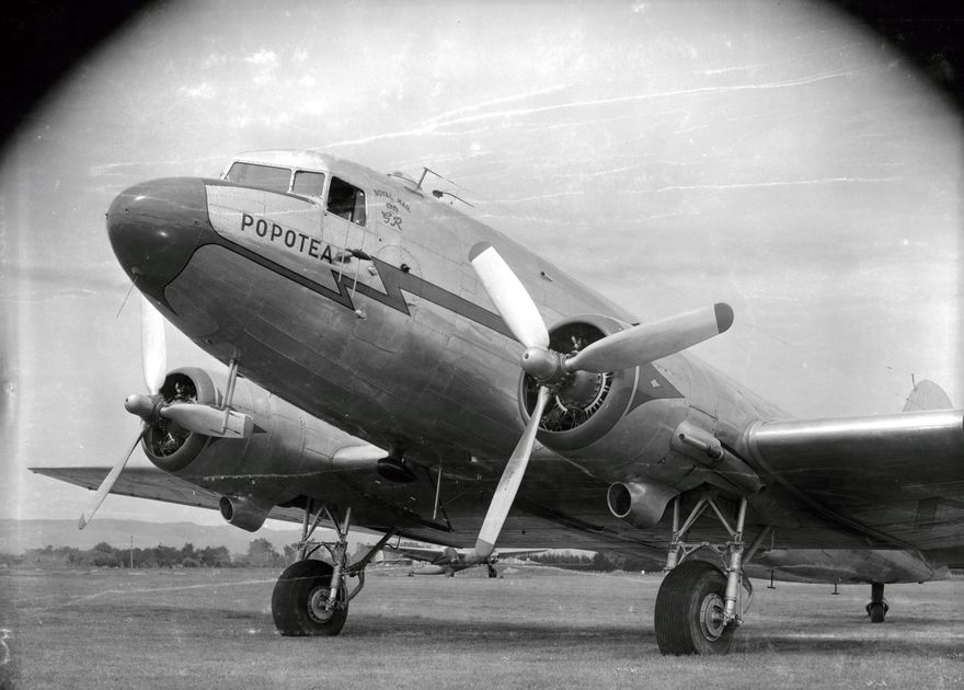 The National Airways Corporation aeroplane ZK-APB ‘Popotea’, made by the Douglas Aircraft Co. (US), sits on the grass at what is thought to be Milson Airport. ZK-APB was the first NAC DC-3 to be properly fitted out as an airliner, rather than just an ex-military transport with basic seating. It was Ex-NZ3534 and left military service on 28 April 1947. It was flown to Melbourne to be refitted and to be renamed Popotea. It became a National Airways Corporation airliner DC-3D on 9 September 1947.