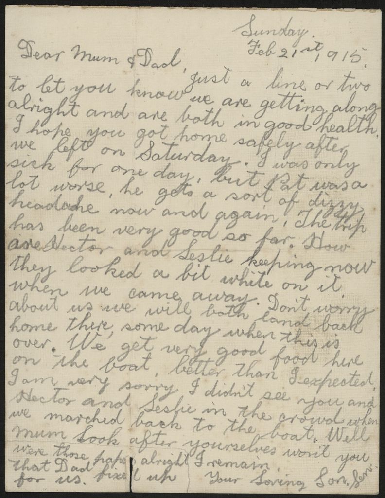 Len Argyle (1894-1915) was one of the sons of Henry and Alice Argyle of Bunnythorpe. He and his brother Pat (Percival) enlisted in the NZ Expeditionary Forces together and served in World War One. This letter from Len to his parents, was sent from the ship that took them to Europe, after training at Trentham.