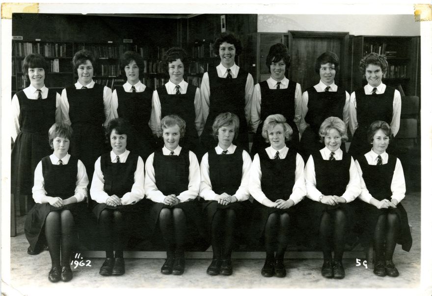 Palmerston North Girls High School - class 5G. Top row (L-R): Gloria Moletta, Sandra Cook, Elaine Ellery, Pat Bellhouse (nee Folley), Susan Beattie, Marie Knight, Lila Stansfield. Front row (L-R): Sheryl Wilby, Margaret Taylor, Rosemary Crotty, Jennifer Klatt, Grace Henderson, Cherie Pearce, Diane Law.
