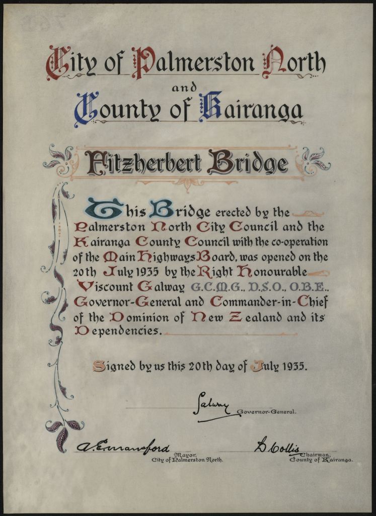 Illuminated notice of the opening of the new Fitzherbert Bridge
