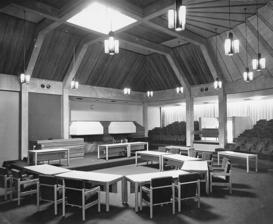 A new civic centre was constructed for the Palmerston North City Council 1976-1980, with Council staff moving in January 1980. It consisted of Council offices, Council Chamber and Convention Centre. the Council Chamber is connected to the CAB via an internal ramp.