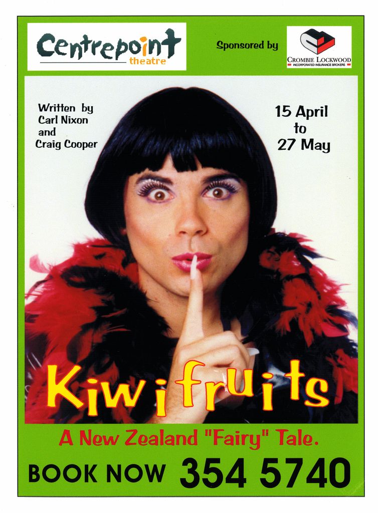 Promotional image for the play 'Kiwifruits,' performed at Centrepoint Theatre between 15 April and 27 May 2000. The play was written by Carl Nixon and Craig Cooper and directed by Lyndee Jane Rutherford, with choreography by Sally Stopforth.