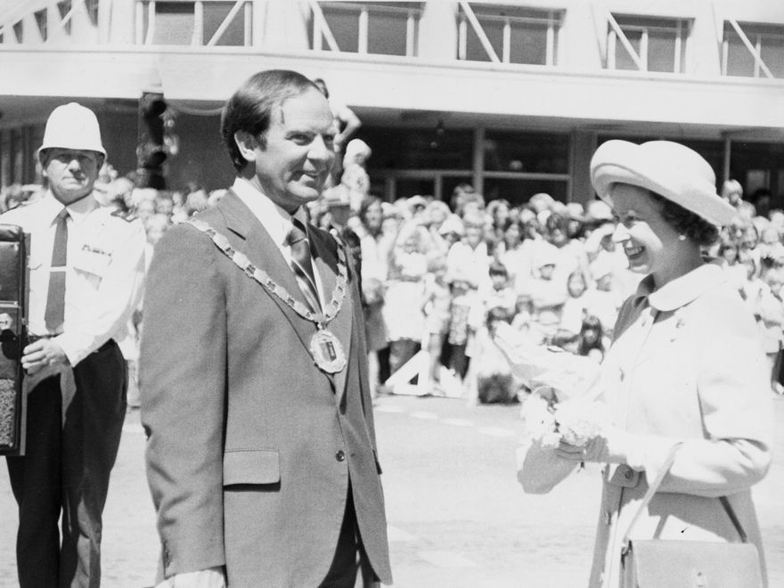 Queen Elizabeth II with Brian Elwood, Mayor of Palmerston North