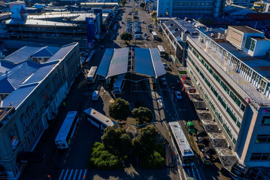 An aerial view of the bus station at the junction of Main Street and The Square.