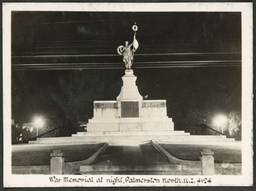 The war memorial in The Square lit up at night. It was built in 1926 and records the names of local soldiers who died fighting for New Zealand in all wars. One of a series of images of Palmerston North produced for sale.