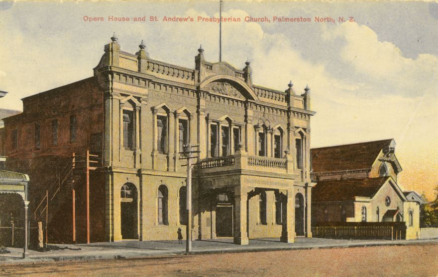 The Municipal Opera House of Palmerston North, designed by F J Wilson and built by J Trevor and Sons, was erected in 1904-1905 and opened 12 July 1905. In 1952 it was condemned unsafe by the Palmerston North City Council and was strengthened and remodelled both inside and out in 1955. It was sold by the PNCC to a businessman in 1996 and demolished.The photograph also shows the second St Andrew's Presbyterian Church, built in 1893. This building was replaced by another church in 1957.