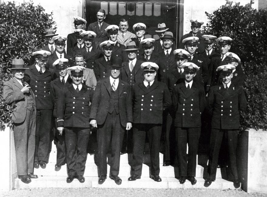 Australian Naval Officers pictured with the Mayor, A.E. Mansford (suited, centre front), Joe Hodgens, Member of Parliament for Palmerston North 1935-1946, and others, on the steps of the Main Building, Massey Agricultural College (now Sir Geoffrey Peren Building, Massey University). The visit occured during WWII when a military Staff College was located at Massey.