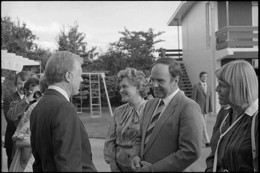 This image was taken by the Evening Standard on the 10th of February 1984 but was not published. It depicts former United States president Jimmy Carter and his wife Rosalynn arriving in the city for a three-day visit. They were greeted by members of the Lions Clubs of Central Districts and Manawatu and civic leaders such as Mayor Brian Elwood.