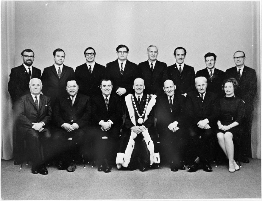 From left. Back row: Ken Wynks; Brian Elwood; Gordon Cruden; Maurice Sexton; Peter Hall - Town Clerk; Neil Johansen - City Engineer; Trevor De Cleene; Gordon Kear. Front Row: Gordon Brown; Sam Mihaere; Harry Bodell; Des Black - Mayor; David Spring; Pat Kelliher; Joyce Dunmore.