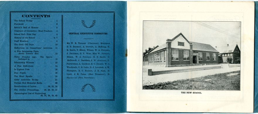 Terrace End School 50th jubilee booklet (1884-1934). Includes school history, photographs, local business advertisements, timeline of school-related events, and accounts of the jubilee celebrations.