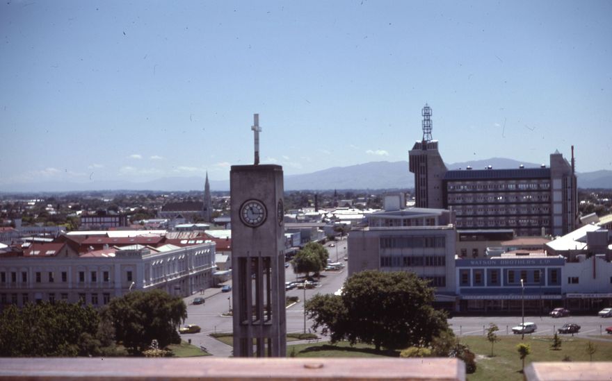 The Square and the Clock Tower are in the foreground, with the Post Office and the Public Library at the top of Main Street. Watson Brothers is next to the Library with the Telephone Exchange building behind. (Probably taken from the new Palmerston North Civic Administration Building)