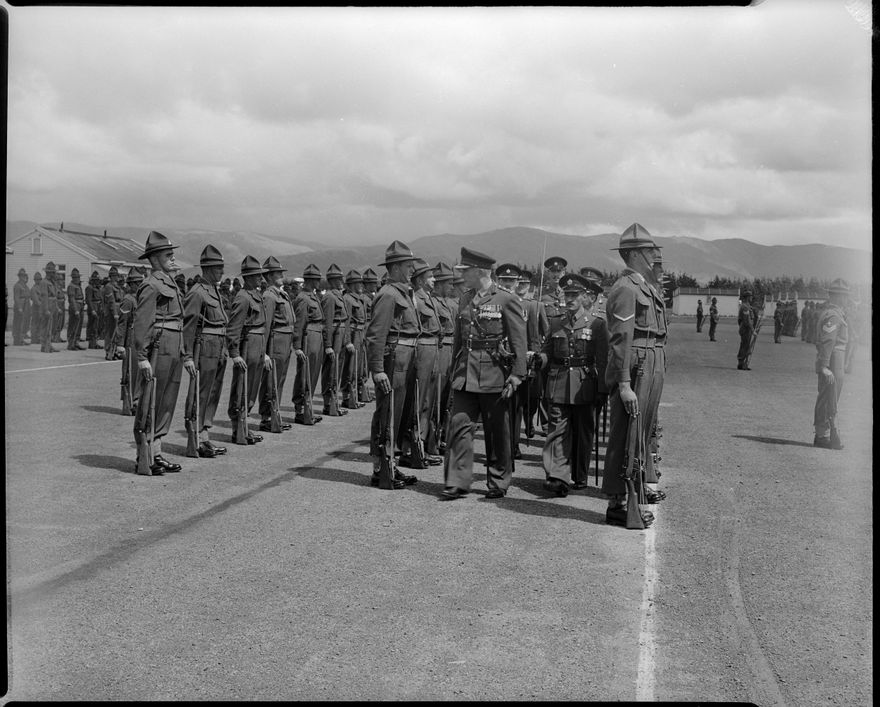Army personnel on parade being inspected by senior officers at the Linton Army Camp. This negative comes from the Elmar Collection - a large series of semi-identified and unidentified images from the 1930s-1970s.