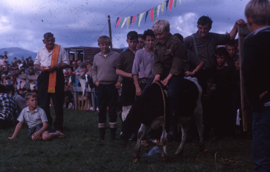 Children line up to have a turn riding a calf at the Linton Rodeo.