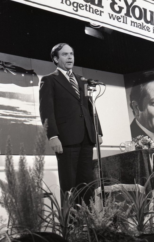 This image was taken (but not used) for a story that ran in The Manawatu Evening Standard on 1 November 1978 “Rowling in top form at opening” Labour leader Bill Rowling opened his general election campaign at Palmerston North’s Opera House with a rousing speech to over 1000 supporters on Tuesday 31 October.