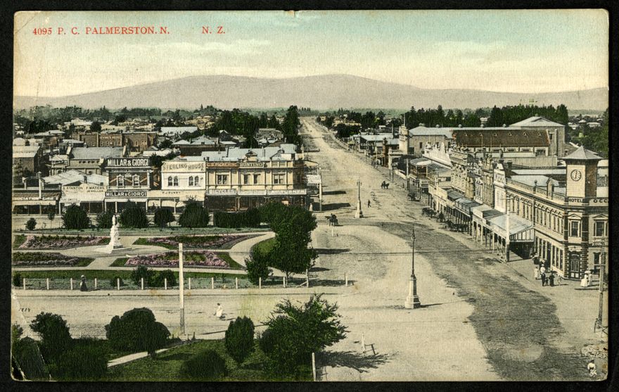 "Looking down Church Street and the north-east corner of The Square. Businesses from left: A Stanton; F Waters Jewellers; Millar and Giorgi; R J Bunny; C S Pickering Bicycles; Bunting Photographic Studio; A Turner. On the corner of Fitzherbert Avenue, on the right, is the Occidental Hotel. Published by Andrew Millar, Stationer, Palmerston North. Postcard no 4095