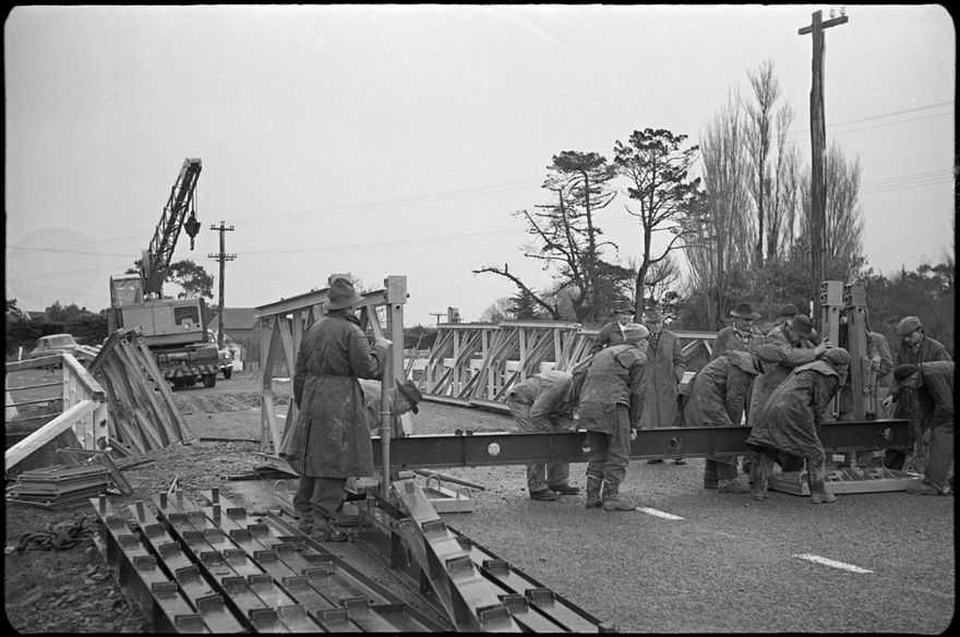 Caption: “Ministry of Works employees busy at work erecting a bailey bridge over the old bridge.”