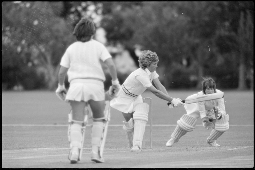 This image was taken (but not used) by the Evening Standard on 19th of January 1982. It depicts Manawatū Women’s cricket team taking on the International Australian Women’s team in a limited over warm-up match for the Hansell's Vita Fresh Women's World Cup 1981/1982. The match was held at Ongley Park in Palmerston North. The Australian team won by 202 runs. The match report ‘Aussies too polished in all facets’ was written by Ford Watson and published the next day:
