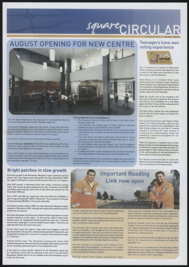 The Square Circular was Palmerston North City Council's monthly community publication, informing Palmerstonians of PNCC initiatives, activites, and events. This month's issue includes: archives photo, Arena 2, Ashhurst walkway, new bridge, Christmas parade, Customer Services Centre, Destination Manawatū, dog control, economic growth, elections, heritage buildings, Kelvin Grove roading, library, Milverton Park, recycling, Te Manawa, waste management.