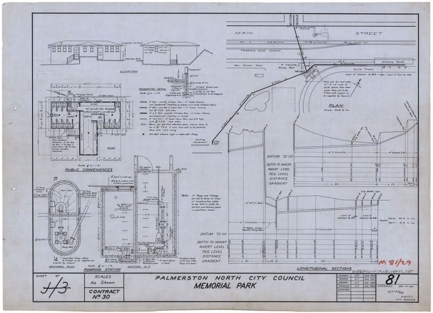 The Palmerston North City Council purchased the site of the old railway ballast pit in 1938 and developed it into a recreational and sporting area. A memorial to citizens killed in World War Two (WWII) was erected and in 1954 Fitzroy Park was officially dedicated as Memorial Park. These plans are not all of the same date but informed the development of the time. The plans cover the general layout, war memorial, running and cycle track, skating rink, clubrooms, dressing shed, toilets, seating, stormwater and cross sections. They also include the proposed plan of the skating rink at Himitangi, and plans for the Cooks Gardens and Western Springs stadium tracks.