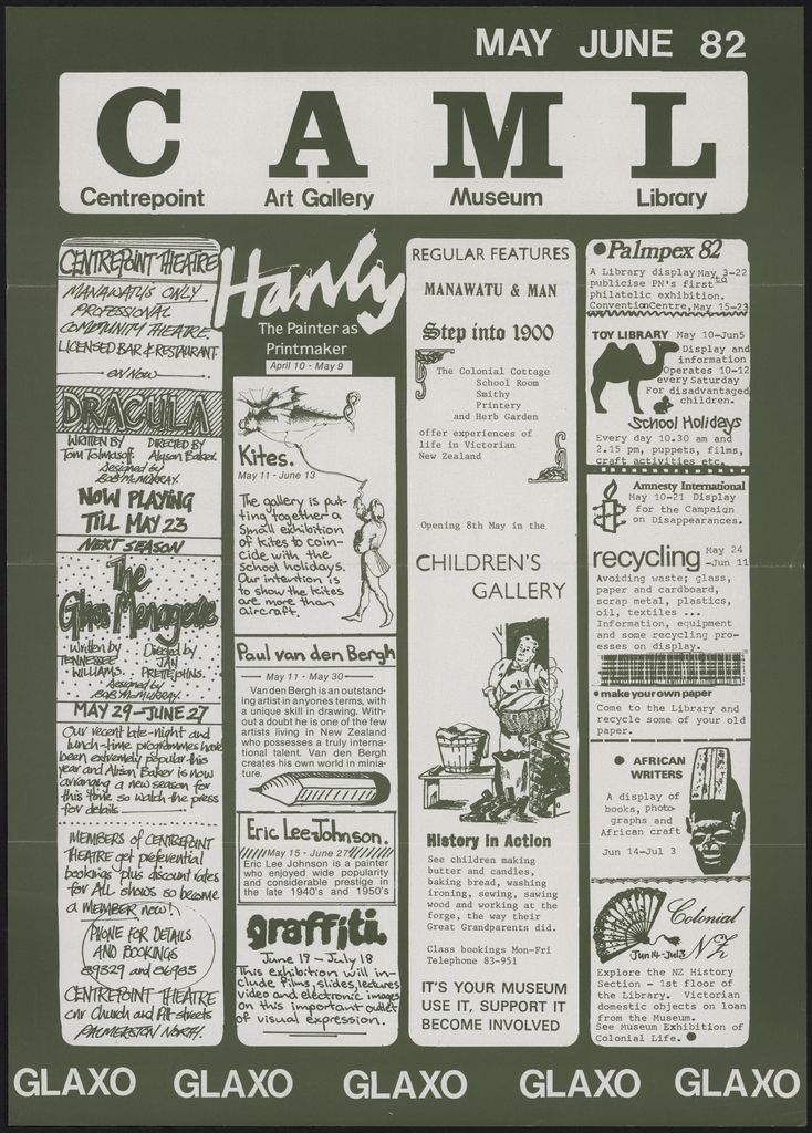 A poster advertising events at Centre Point theatre, the Manawatū Art gallery, Manawatū Museum, and the City Library.