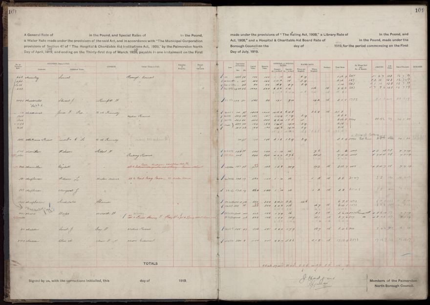 Palmerston North Borough Council rate book, listing rate payers for the years (1 April - 31 March) 1919 - 1920. Gives names, street, owner (if different to rate payer), legal description of property, capital and unimproved values and rates paid.