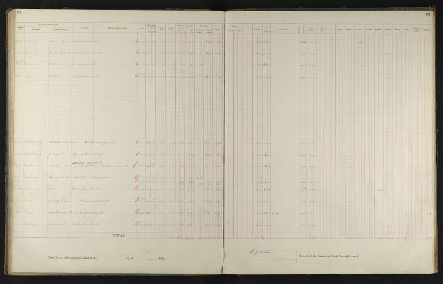 Palmerston North Borough Council rate book, listing rate payers for the years (1 April - 31 March) 1925 - 1926. Gives names, street, owner (if different to rate payer), legal description of property, capital and unimproved values and rates paid.