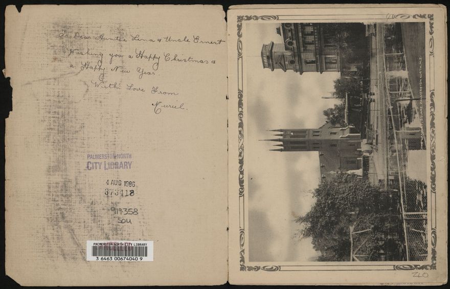 The inside cover of this booklet reads, "To Dear Auntie Lena and Uncle Ernest. Wishing you a Happy Christmas & a Happy New Year. With Love From Muriel". The Souvenir has images of many popular scenes from Palmerston North, including The Square, the railway yards, the Manawatū Gorge, The Esplanade, the dam in Turitea, the A&P Showgrounds and the Fitzherbert Bridge.