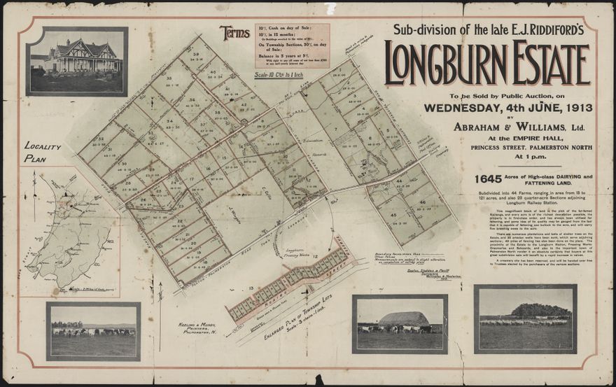 An advertisement for the auction of E.J Riddiford's estate in Longburn. Riddiford's 1645 acres were to be sub-divided into 44 properties.