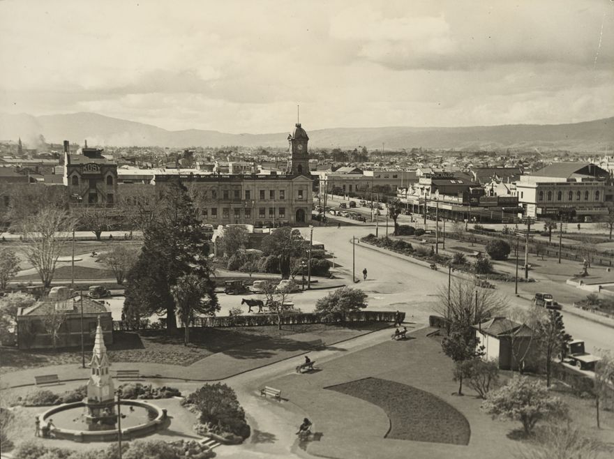 Looking across The Square from the top of the C M Ross department store (now the Central Library) to the Chief Post Office on the corner of Main Street.