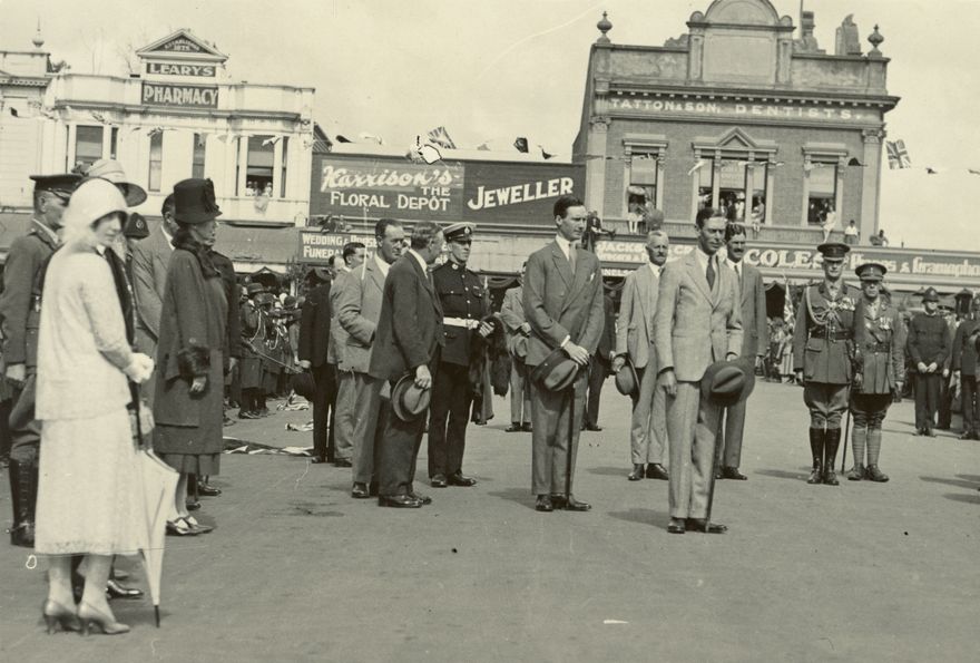 The royal couple visited Palmerston North as part of their New Zealand tour in 1927. The Duke of York stands to attention after inspecting troops of Scouts, Girl Guides and the Seventh Battalion New Zealand Army’s Guard of Honour. The Duchess of York can be seen on the left, in the light coloured outfit. The Duke and Duchess became King George VI and Queen Elizabeth in 1936.