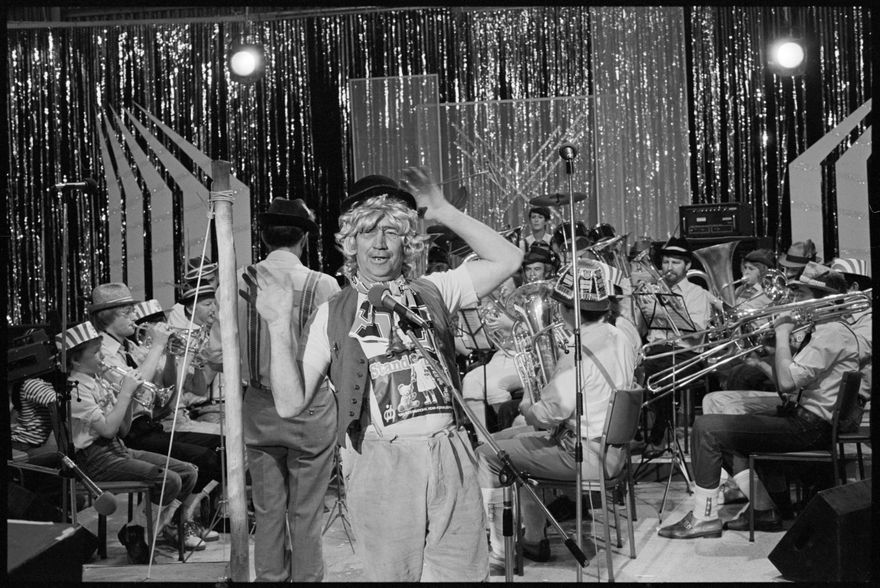 An unknown Beerhall Brass Band entertains at the Pascal Street Stadium during the 1981 Telethon live broadcast.