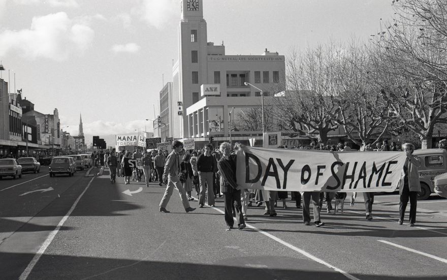 The 'Day of Shame' march was the largest of several protest events before and after the Springbok Rubgy team played Manawatū in Palmerston North in 1 August 1981. The March moved from St Patrick's cathedral, down Broadway Avenue, circled the Square, ending in the 'Lion's Den' quadrant. 500 demonstrators began the march but the numbers may have swelled to 1000 by its end. The protesters were occasionally heckled by pro-tour members of the public. March chants included "Don't scrum with racsit scum", "and We don't want your racsit tour".