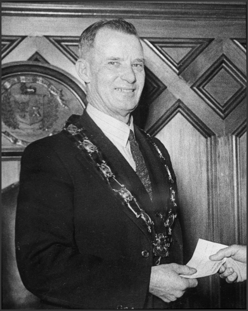 Geoffrey Tremaine was the 19th Mayor of Palmerston North, from 1947-56. The other portion of this photograph shows Arthur Hopwood handing a cheque for 50,000 pounds, to Geoffrey Tremaine to establish the Arthur Hopwood Charitable Trust. This trust distributes money annually to charitable organisations in the Palmerston North and Blenheim districts.