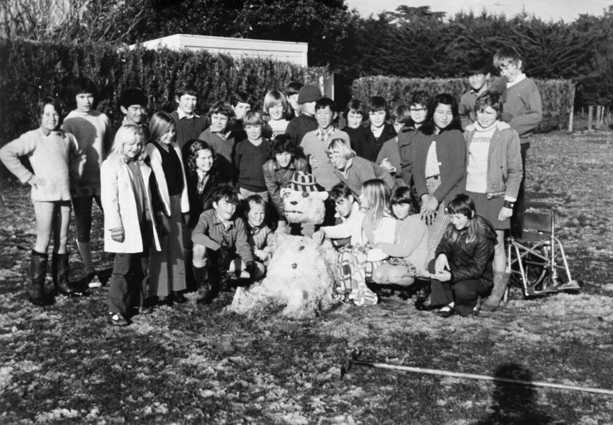 Snow fell at Whakarongo 23 July 1975. The School celebrated with a snowman-building competition. One of the snowmen, with pupils, said to include: Jan Oden; Jillian and Michelle Lyn Cleghorn; Bruce and Russell Burr; Kevin Huntley; Margaret Spall; Laurie Brocklebank; Michael Summers; Suzanne Fryer; Laurence Joe. Idenitified are: Murray Blackley (leaning over towards the head of the snowman on right, blonde hair). From left standing on ground: Debbie Hughes; Jenny Young; Murray Olsen (with glasses).