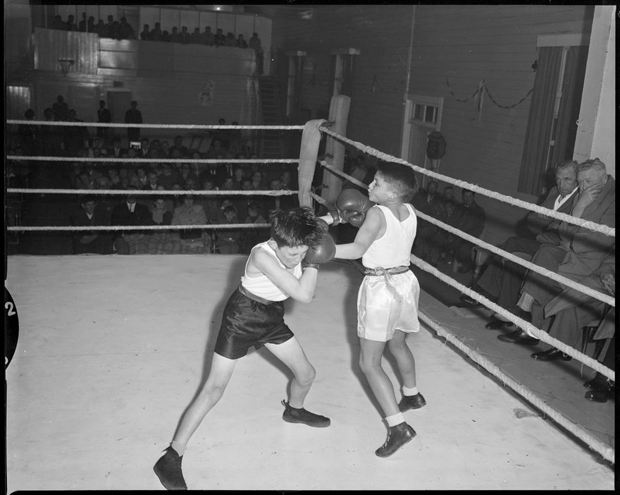 This image was taken for a story that ran in The Manawatu Evening Standard on 01 September 1960 "L. Rolls is here seen landing a classic straight left to the side of M. Tracey's head at the Manawatu Boxing Association's amateur tournament. Throughout the evening Rolls gave an almost flawless exhibition of boxing, winning all of his three bouts. He was presented with the cup for the most scientific boxer."