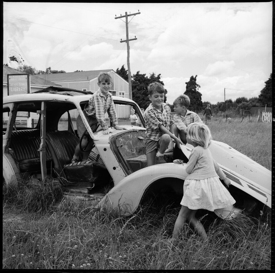 This image was taken for a story that ran in The Manawatu Evening Standard on 26 December 1962, "With school over for a few weeks, these children found much enjoyment with this old wreck at the Takaro kindergarten in Botanical Road. From the left are Gary Poulson, Terry McAlister, David McAlister and Linda McAlister." [This picture differs lightly from the photo run in the newspaper, it is a similar image and taken from the same angle, but the girl's face is visible in the newspaper image.]