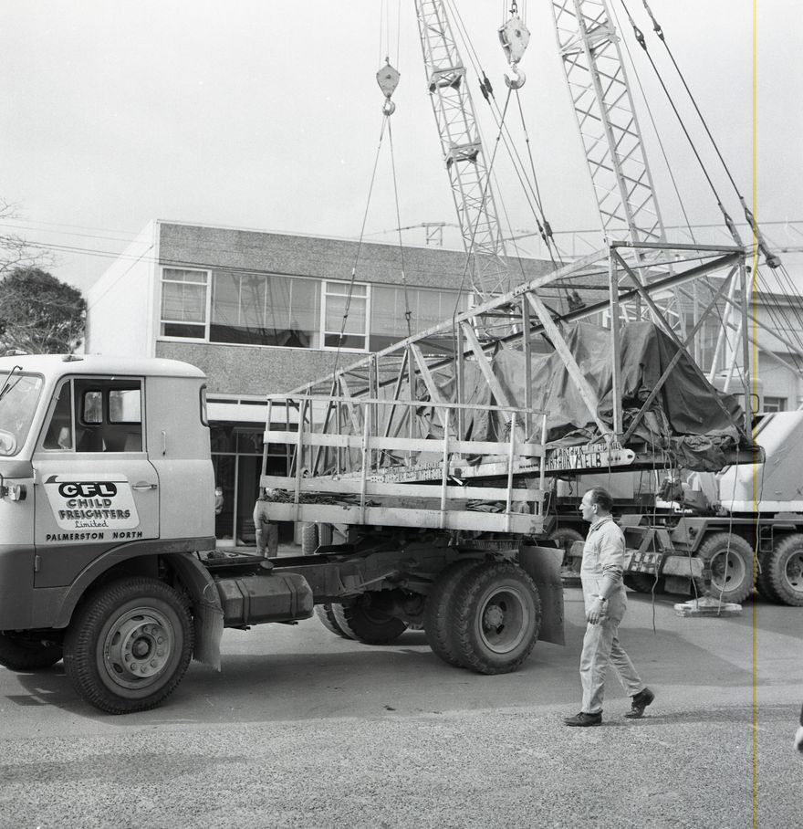 This image was taken for a story that ran in The Manawatu Evening Standard on 27 September 1969. The caption was illegible, but the negative packet reads, "New Knitting Machine Being Delivered to Blue Bell Knitwear".