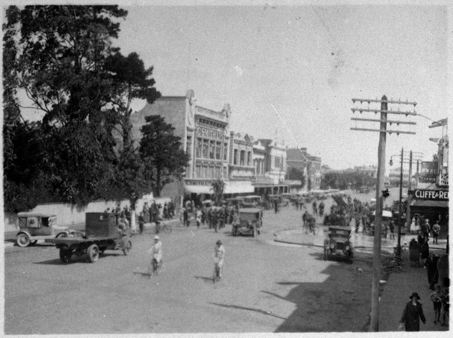 This photograph looks down Broadway (formerly Broad Street), towards The Square. Many pedestrians, cyclists and motorists can be seen looking at the fire engine on the right hand side. Its ladder is clearly visible and a fire hose can be seen on the road.