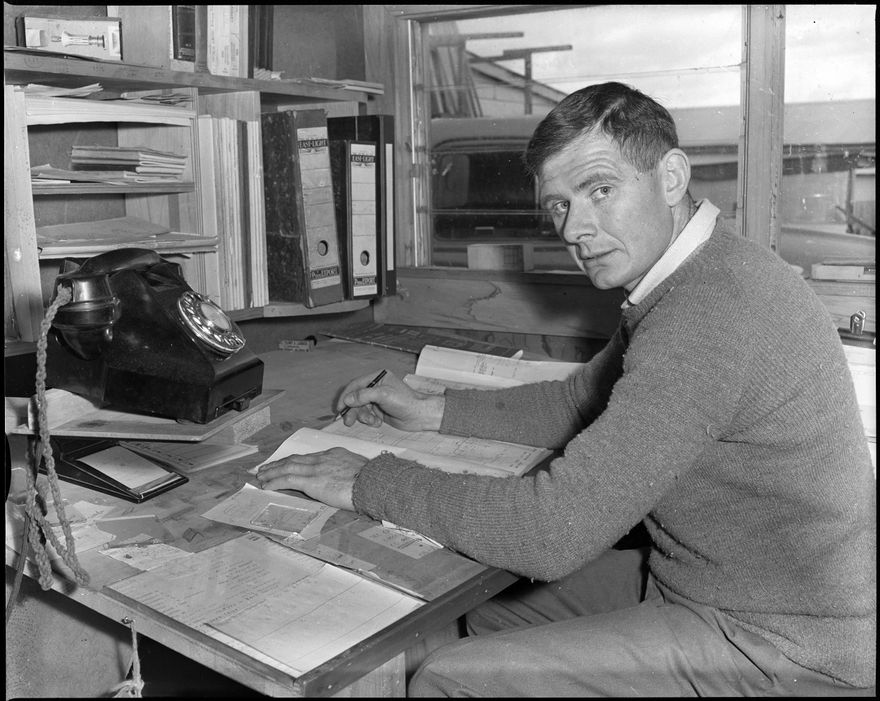 This image was taken for a story that ran in The Manawatu Evening Standard on 6 July, 1959. "Back at work this morning at the desk of the joinery factory he owns in partnership, B. E. L. Finlay, Manawatu's sole All Black for the first New Zealand Test team to meet the British Isles Rugby tourists at Carisbrook, Dunedin, is caught by the "Manawatu Standard" camera. Alongside him is the "hot" telephone which still rings constantly bearing messages of congratulations."
