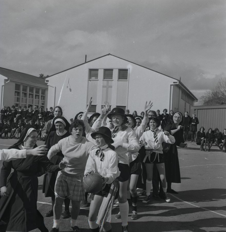 This image was taken for a story that ran in the Manawatu Evening Standard on 20 August 1970 with the caption, "In a grueling netball match which included an assortment of rucks, scrums and lineouts with a smattering of fancy dress, prefects of St Joseph's School in Fitchett Street, were beaten by a superior staff side 36-18. Informed sources have it that the staff side had several ring-ins including a bank manager. Our picture shoes a tense moment as Annette Heiden and Sister Anthony chase after the ball." St Joseph's School was a Catholic High School for girls. When the lease of its grounds and buildings ran out in the late 1970s, it was merged with St Peters College. The Metlife retirement village now stands in Fitchett Street on the old school site.