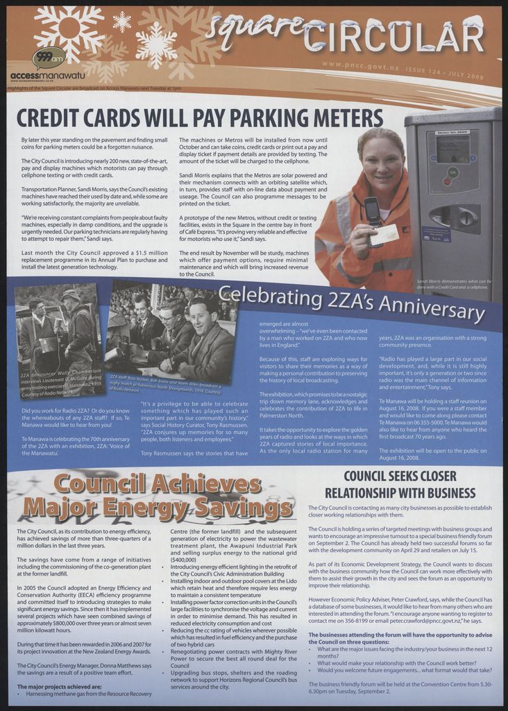 The Square Circular was Palmerston North City Council's monthly community publication, informing Palmerstonians of PNCC initiatives, activites, and events. This month's issue includes: 2ZA radio, annual plan, Economic development strategy, energy efficiency programme, Jaycee Trust travelling fund, parking meters, pedestrian crossings, rates rebate scheme, community meetings, Highbury Library, City Future recreation strategies, youth crime prevention, contact centre, archives photo, netball at Arena Manawatū, cricket at Ongley Park, The Regent.