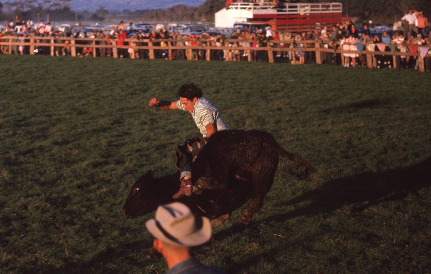A cowboy being thrown from a bucking steer at the Linton rodeo. Spectators watch behind a safety fence in the background.