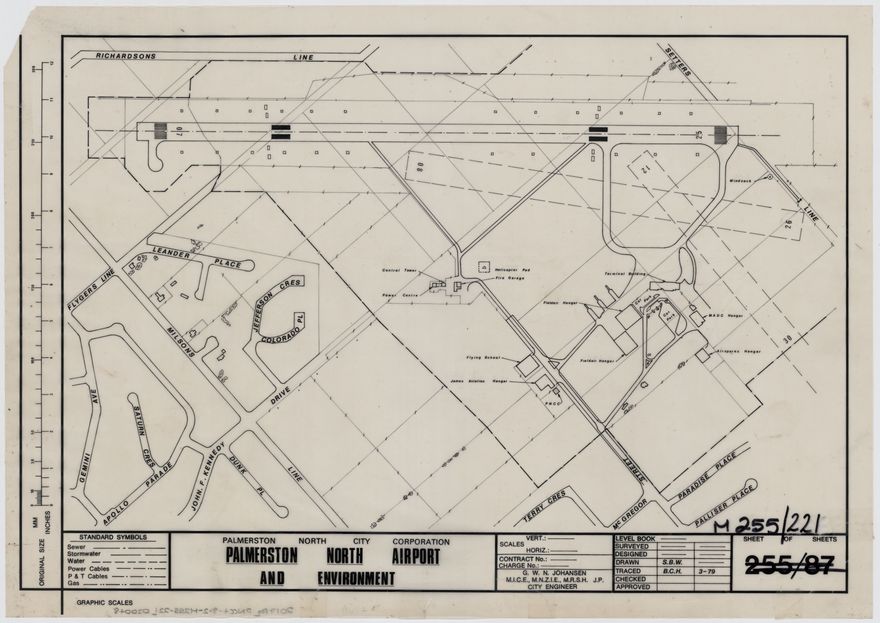 Milson Airport, as it was first known, was started in the 1930s. The plan shows surrounding streets and layout of buildings and runways at the airport.