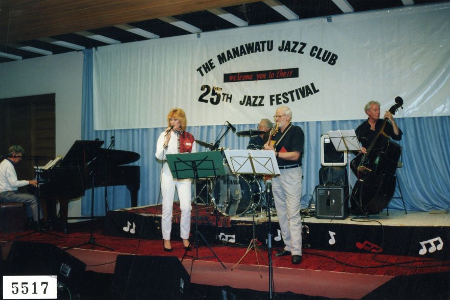 The Bob McNeely Quartet and Vikki Carryl performing at the 25th Annual Manawatū Jazz Festival. L-R: Barry Walden (piano) Vikki Carryl (vocal) Vern Clare (drums) Bob McNeely (guitar) Jim Wilson (bass)