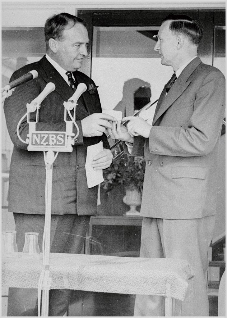 The Eventide Home, designed by Reginald and William Thorrold-Jaggard, was built as a Rest home and hospital for the elderly. Lord Cobham, Governor General of New Zealand (at left), opened the building and was handed a gold key, traditionally given by the architects to the visiting dignitary, by William Thorrold-Jaggard (at right). In 1961 it was renamed as the Brightwater Home.