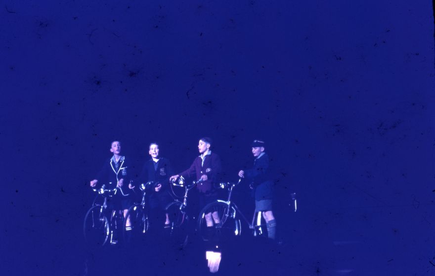 This image depicts younger scouts with their high school uniforms and bicycles, singing, at the Gang Show 1963.